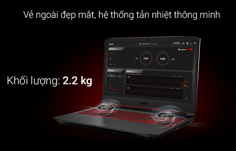 Nói đến tản nhiệt thì không thể không nhắc đến công nghệ Acer Coolboost có 4 lỗ thông gió dưới có thể tăng tốc độ quạt lên 10% và khả năng làm mát CPU / GPU lên 9%. Cùng với phím tắt Nitro Sense được trang bị ngay trên bàn phím để bạn dễ dàng truy cập vào ứng dụng, dễ dàng kiểm soát nhiệt độ của máy.