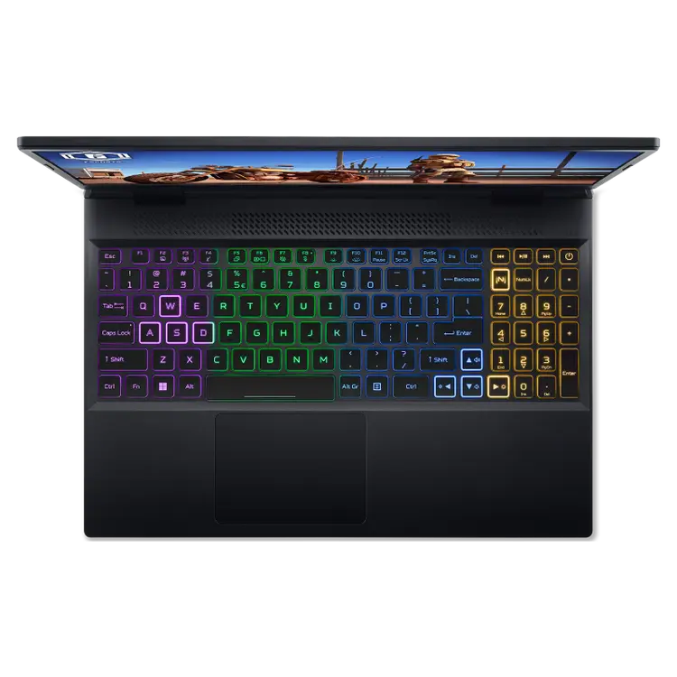 Acer Nitro 5 sở hữu thiết kế gaming hầm hố, với màu đen mạnh mẽ và bàn phím LED RGB 4 vùng tùy chỉnh theo ý thích. Bàn phím chắc chắn với hành trình phím hợp lý giúp người dùng dễ dàng gõ, đặc biệt là khi chơi game hay làm việc lâu dài.