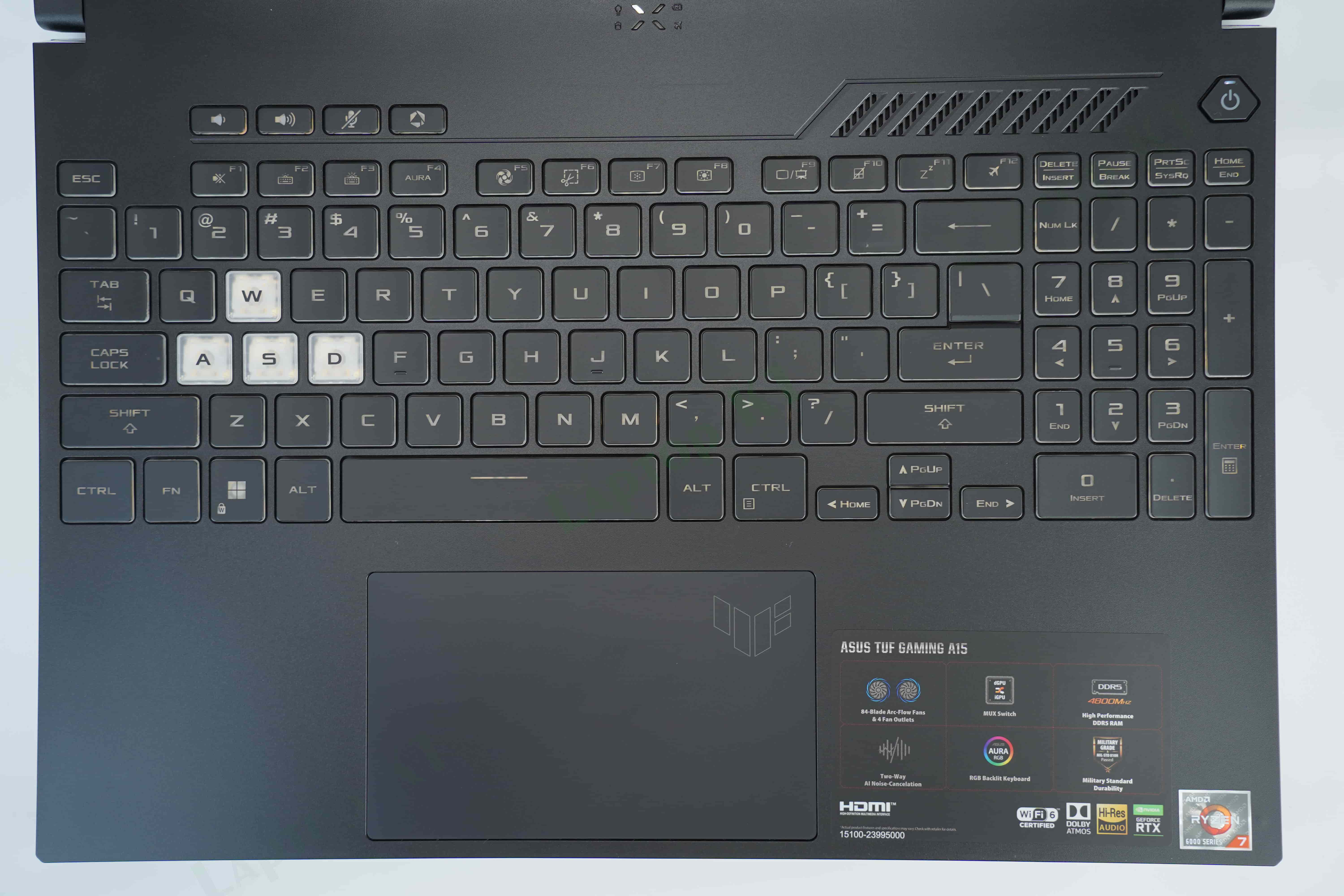 Được thiết kế để phục vụ các game thủ, bàn phím Asus TUF Gaming A15 FA507RC-HN051W có hành trình phím sâu 1,7mm, công nghệ chiclet cực nhạy, 4 phím nóng WSAD được làm trong suốt nổi bật, công nghệ Overstroke cho tốc độ phản hồi nhanh hơn. Bạn có thể thao tác chính xác và nhanh nhạy trên bàn phím này. Tất nhiên độ bền của bàn phím là điều không phải lo khi mỗi phím bấm đều có tuổi thọ 20 triệu lần nhấn. Ngoài ra, bàn rê chuột cảm ứng cũng được làm lớn hơn 26% so với thế hệ trước, cho bạn thao tác dễ dàng khi điều hướng, duyệt web, làm việc.