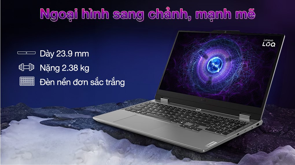 Nhìn qua chắc hẳn anh em sẽ nhận ra Lenovo LOQ 2024 đã được thay đổi diện mạo hoàn toàn mới so với bản 2023. Lenovo LOQ 2024 có kiểu dáng đơn giản, không quá hầm hố nhưng vẫn làm nổi bật lên vẻ đẹp mạnh mẽ, cứng cáp mà một chiếc laptop gaming cần có. Viền màn hình Lenovo LOQ 2024 cũng được thiết kế mỏng đáng kể, máy có trọng lượng khá nhẹ, không quá nặng nề so với nhiều sản phẩm laptop gaming khác trên thị trường.