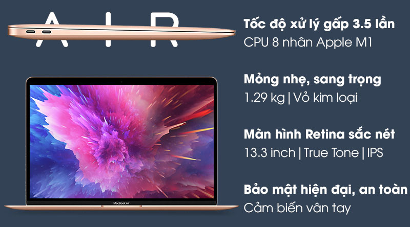 Laptop MacBook Air M1 thuộc dòng laptop sang trọng, cao cấp, có cấu hình mạnh mẽ, có thể xử lý được các tính năng văn phòng lẫn đồ hoạ tùy vào mong muốn của bạn. Đặc biệt, thời lượng pin kéo dài, thiết kế mỏng nhẹ sẽ giúp bạn thuận tiện trong việc di chuyển nhiều nơi để làm việc.